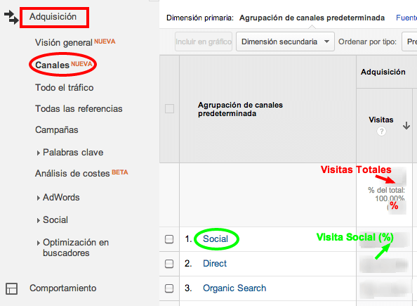 Entramos en la cuenta de Google Analytics indicando el tramo de fecha que queramos tomar datos de la marca, Clic en menú lateral Adquisición, al pulsar en Canales aparecerá en pantalla un listado con el número total de visitas, y el desglose según origen de las visitas. Nos fijamos en Social y anotamos el número. El porcentaje de visitas Sociales (no el incremento de visitas) nos lo da directamente GA, que responde a la siguiente expresión.