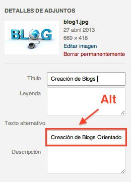 para que una imagen esté optimizada para SEO debe agregarse el atributo “Alt”, texto alternativo a la imagen que ayuda a los buscadores a obtener información de lo que quieres decir con la imagen. Te muestro un pantallazo de la galería de imágenes de WordPress, donde puedes ver donde debes insertar tu texto Alt (aprovechala para colocar palabras claves).