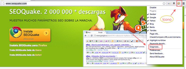 Entra a través de tu navegador en la página que quieras analizar, como por ejemplo la tuya, y acto seguido, has clic con el botón derecho del ratón en el icono SEOQuake, verás que se abre un desplegable. Pulsa Diagnosis… (es la que nos interesa, aunque puedes investigar todas las posibilidades que aparecen)